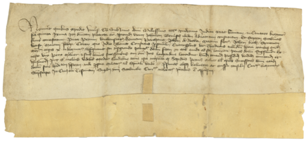 Dokument wydany w 1411 roku w Kazimierzu przez ławę miejską, w którym ławnicy kazimierscy, z Szymonem Januszem Worstem w składzie, stwierdzili, że Teodoryk sukiennik (nr 61), opiekun prawny proboszcza i klasztoru Bożego Ciała, odstąpił Piotrowi Molnerowi (nr 68) dom koło kościoła św. Wawrzyńca – oraz zbliżenie zapisu imienia (Archiwum Narodowe w Krakowie, sygn. perg. 153)