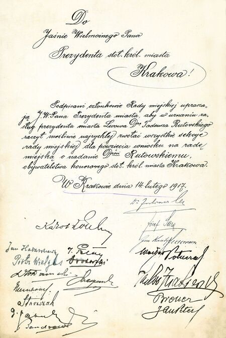 Tytuł nadany uchwałą Rady Miejskiej podjętą na posiedzeniu nadzwyczajnym tajnym 18 lutego 1917 r. (DzRMK 1917, nr 2, s. 11–12), gdy prezydentem miasta był Juliusz Franciszek Leo. Wnioskowała grupa radnych, wniosek poparły wszystkie sekcje (komisje) Rady. Asumptem do uhonorowania był szczęśliwy powrót Tadeusza Rutkowskiego z rosyjskiej niewoli. W tymże dniu po tajnym posiedzeniu Rady i nadaniu tytułu otwarto uroczyste posiedzenie jawne z udziałem uhonorowanego i jego gości (por. s. 153). Wieczorem prezydent wydał przyjęcie na cześć honorowego obywatela w sali restauracyjnej Grand Hotelu.
