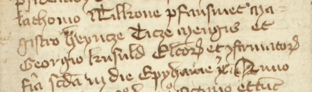 Z księgi radzieckiej Kazimierza obejmującej lata 1387–1390: fragment wpisu dokumentującego wybór rady miejskiej na rok 1388, w składzie której znalazł się Ticze Mengis – oraz zbliżenie zapisu imienia (Archiwum Narodowe w Krakowie, sygn. K 3, s. 77)