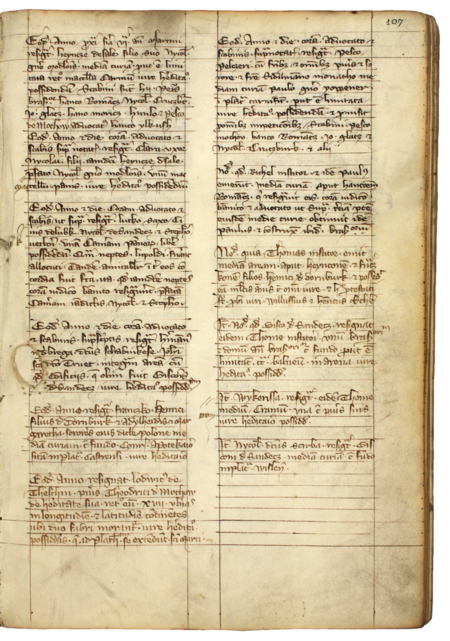 Z „Najstarszej księgi” strona 107 z wpisem z 1333 roku, dotyczącym zakupionej przez Tomasza kramarza połowy placu przy ul. Grodzkiej – oraz powiększenie zapisu imienia (Archiwum Państwowe w Krakowie, sygn. rkps 1, s. 107)