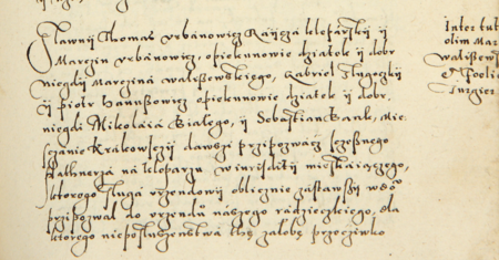 Z kleparskiej księgi radzieckiej obejmującej sprawy z lat 1569–1578: wpis dotyczący sporu, w którym Tomasz Urbankowicz występuje jako opiekun małoletnich dzieci i majątku zmarłego Marcina Waliszewskiego – oraz zbliżenie zapisu imienia i urzędu (Archiwum Narodowe w Krakowie, sygn. KL 28, s. 419)