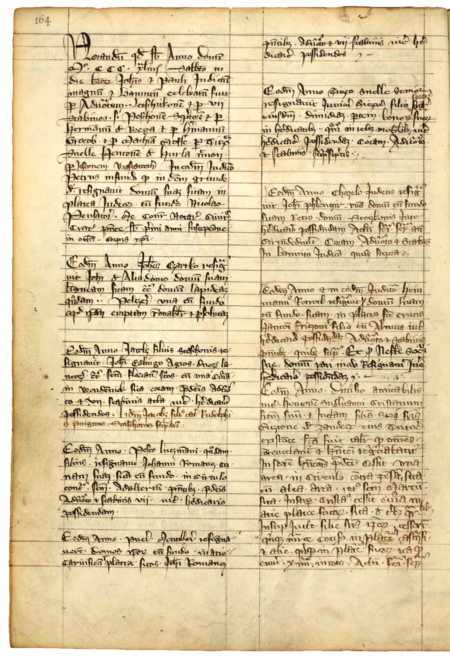 Z „Najstarszej księgi” strona 164 z wpisem z 1344 roku, stwierdzającym, że Tyczko Snelle starszy oddał połowę swoich dóbr siostrzeńcowi, Tyczkowi Snellemu młodszemu – oraz powiększenie zapisu imienia (Archiwum Państwowe w Krakowie, sygn. rkps 1, s. 164)