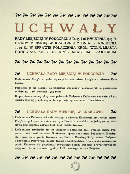 | 15–16 kwietnia 1913 | Podjęcie przez radę miasta Podgórza uchwały o zgodzie na połączenie Krakowa i Podgórza oraz przyjęciu projektu warunków układu w brzmieniu przyjętym 7 kwietnia (1 radca był nieobecny, przed głosowaniem salę opuściło 3 radców, za uchwałą oddano 25 głosów, przeciw uchwale 6). |