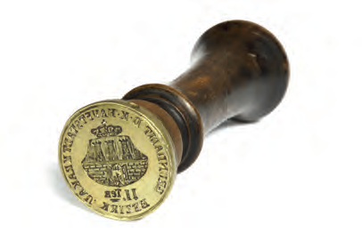 | Oryginalna pieczęć i odciski pieczęci 3 urzędów miejscowych obowiązujące w latach 1855–1866, w praktyce stosowane jeszcze w latach 70. xix w. (rysunek stempla w lustrzanym odbiciu) | |