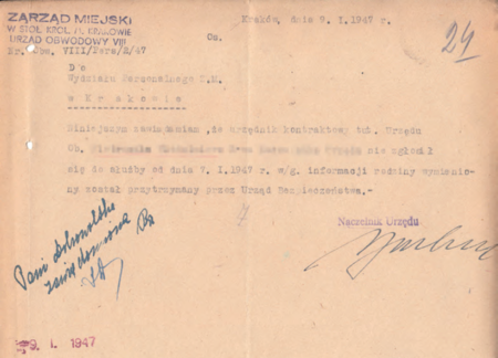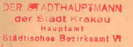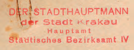 Po przejęciu Zarządu Miejskiego przez władze okupacyjne większość przedwojennego personelu urzędniczego pozostała w służbie miejskiej na swoich stanowiskach (oprócz wyższych stanowisk kierowniczych obsadzonych przez okupanta), chroniąc na swoim miejscu pracy to, co ochronić się dało; najniższą, choć oczywiście trudną, ceną było zadeklarowanie lojalności wobec nowej administracji – tu tego rodzaju akt złożony w sierpniu 1941 r. w obecności kierownika miejskiego urzędu obwodowego (Archiwum Zakładowe Urzędu Miasta Krakowa, sygn. spis 3759/6392)