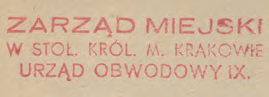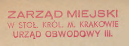 Uwaga I: w połowie 1950 r. w związku z reformą systemu władz terytorialnych i likwidacją organu wykonawczego w postaci Zarządu Miejskiego oraz zainstalowaniem w jego miejsce Prezydium Miejskiej Rady Narodowej w Krakowie przejściowo wprowadzono pieczęcie obrazujące podporządkowanie urzędów obwodowych temu nowemu organowi. Poniżej zachowane odciski pieczęci z tego przejściowego okresu w komplecie pochodzące z dokumentów sporządzonych we wrześniu 1950 r. Zwraca uwagę „chałupniczy” sposób wykonania tych pieczęci, sklejanych z fragmentów różnych innych, wcześniejszych pieczątek.
