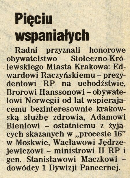 Duplikat dyplomu honorowego obywatelstwa oraz notatka prasowa z „Gazety w Krakowie” z 1993 r., nr 113, dotycząca nadania tytułów honorowych obywateli Krakowa 14 maja 1993r.