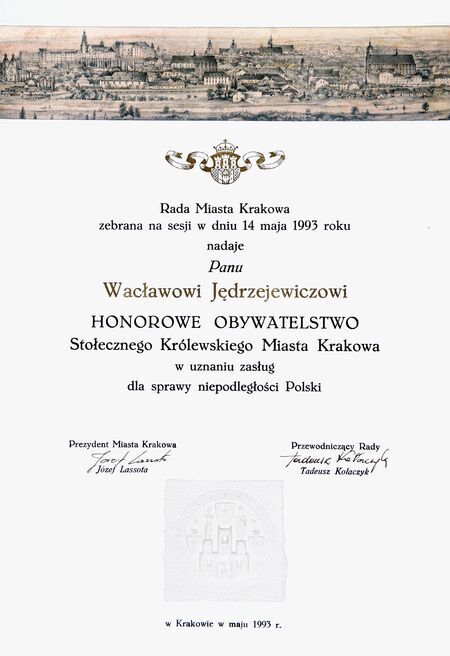 …w uznaniu zasług dla sprawy niepodległości Polski… (z uchwały Rady Miasta Krakowa nr LXXXII/533/93) |