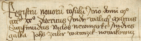 Z księgi radzieckiej Kazimierza obejmującej lata 1416–1433: fragment wpisu dokumentującego wybór rajców na rok 1420, z Wawrzyńcem Nowakowiczem w składzie – oraz zbliżenie zapisu imienia (Biblioteka Jagiellońska, sygn. rkps 1045/2, k. 70)