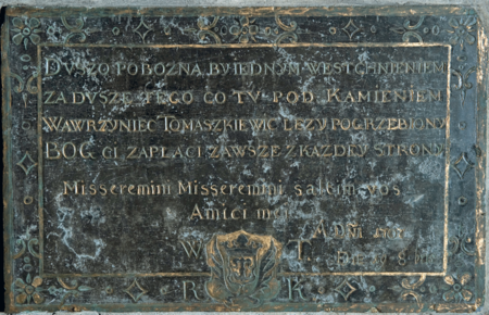 Tablica nagrobna z czarnego marmuru zmarłego w 1707 roku rajcy Wawrzyńca Tomaszkiewicza w prawej nawie kościoła Bożego Ciała w Kazimierzu, obok wejścia do dawnej kaplicy Brackiej, dzisiaj św. Anny; na tablicy poniżej inskrypcji epitafijnej gmerk zmarłego, podobny do herbu Gozdawa, otoczony inicjałami: W[awrzyniec] T[omaszkiewicz] R[ajca] K[azimierski]
