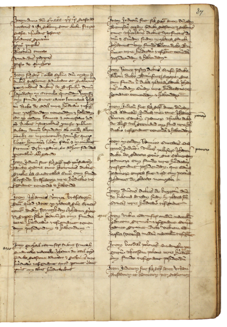 Z „Najstarszej księgi” strona 87 z wpisem z 1329 roku, potwierdzającym, że Wilusz kuśnierz oddał Janowi ze Sławkowa, swojemu zięciowi, kram sukienny – oraz powiększenie zapisu imienia (Archiwum Państwowe w Krakowie, sygn. rkps 1, s. 87)