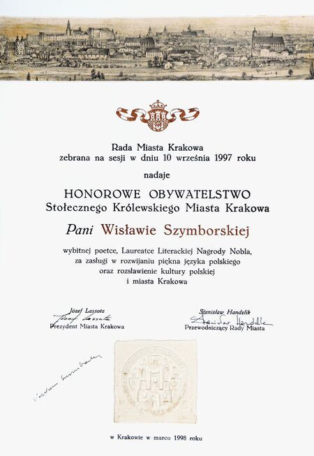 Z uroczystości wręczenia dyplomu honorowego obywatelstwa 11 marca 1998 r. w Pałacu Wielopolskich. Wisława Szymborska w sali Obrad RMK oraz własnoręczny podpis uhonorowanej.