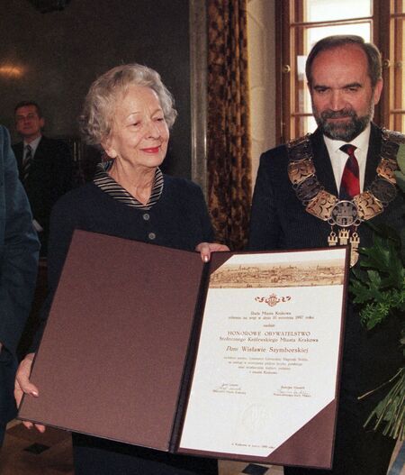 Tytuł nadany uchwałą Rady Miasta Krakowa nr LXXXIX/ 853/98 podjętą 10 września 1997 r., gdy urząd prezydenta miasta pełnił Józef Lassota, a Radzie przewodniczył Stanisław Handzlik. Wyróżnienie nastąpiło w zbliżającą się 1. rocznicę przyznania uhonorowanej Nagrody Nobla w dziedzinie literatury. Wręczenie dyplomu miało miejsce 11 marca 1998 r. podczas uroczystej sesji Rady Miasta Krakowa w sali Obrad RMK w Pałacu Wielopolskich w Krakowie. Duplikat dyplomu zdeponowany został w Muzeum Krakowa.