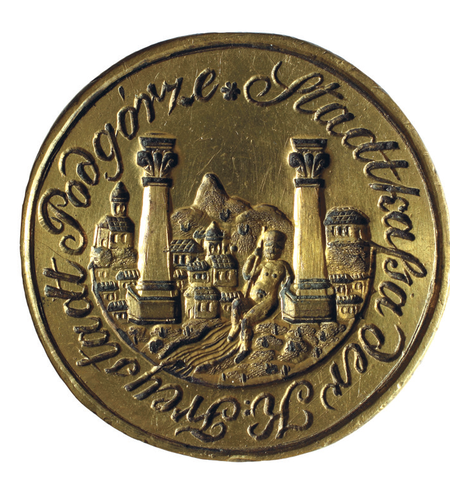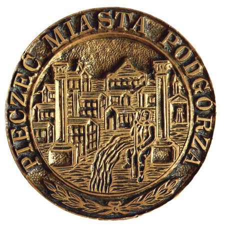 Oryginalne podgórskie urzędowe tłoki pieczętne miasta i magistratu (widok w lustrzanym odbiciu) – pierwszy, z napisem w otoku: STADTKASSA DER K. FREYSTADT PODGORZE – KASA MIEJSKA KRÓLEWSKIEGO WOLNEGO MIASTA PODGÓRZA, używany był w okresie przedautonomicznym, pozostałe trzy, z legendą w języku polskim, obowiązywały po roku 1867. Nie zachowały się tłoki pieczętne z napisami w języku łacińskim – por. odciski na kolejnej ilustracji (Archiwum Narodowe w Krakowie, sygn. T 184, T 192, T 180, T 294)