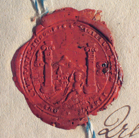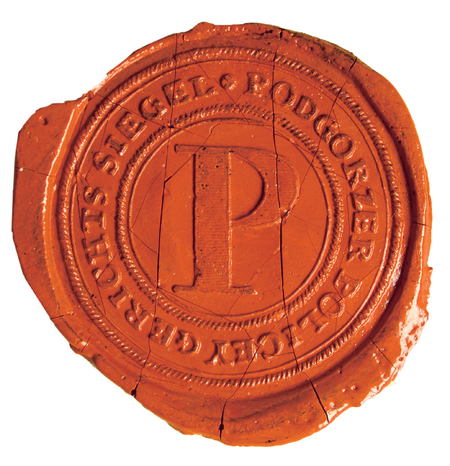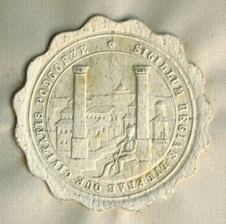 Odciski w laku dwóch najstarszych z zachowanych pieczęci związanych z Podgórzem: z lewej strony odcisk pieczęci sądu kazimierskiego dla Podgórza, pochodzący z 1787 roku; pieczęć ta używana była już wiele lat wcześniej w sprawach dotyczących tamtejszej ludności podległej jurysdykcji Kazimierza z tytułu zamieszkiwania na obszarze stanowiącym własność tego miasta, używano jej do sprzedaży przez Kazimierz tych terenów Austriakom, to jest do 1788 roku. Z prawej strony pochodzący z 1783 roku odcisk pieczęci policyjno-sądowej Podgórza, używanej w okresie organizacji miasta, co najmniej do 1785 roku. W otoku napis: PODGORZER POLICEY GERICHTS SIEGEL (Archiwum Narodowe w Krakowie, sygn. P 1 s. 1, 157)