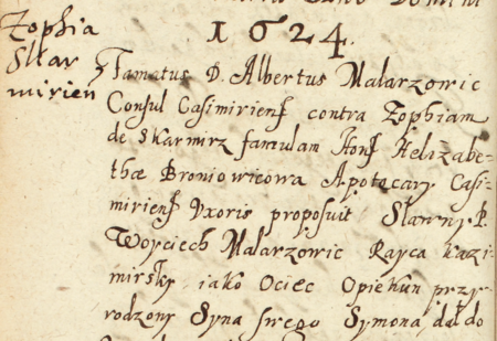 Z księgi radzieckiej Kazimierza obejmującej protokoły spraw kryminalnych z lat 1611–1628: początkowy fragment wpisu toczącej się w 1624 roku sprawy Zofii ze Skalbmierza oskarżonej przez rajcę Wojciecha Malarzowica zwanego Gładysz o uwiedzenie gusłami jego syna Szymona (Archiwum Narodowe w Krakowie, sygn. K 267, s. 206)