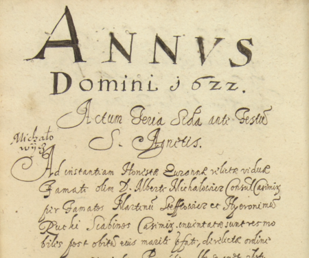 Z księgi inwentarzy mieszczan kazimierskich obejmującej lata 1618–1647: początkowy fragment sporządzonego w 1622 roku spisu inwentarza po zmarłym Wojciechu Michałowiczu, rajcy i burmistrzu kazimierskim – oraz zbliżenie zapisu imienia i urzędu (Archiwum Narodowe w Krakowie, sygn. K 448, s. 48)