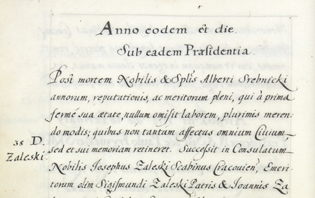 Z urzędowego spisu rajców obejmującego lata 1363–1802 fragment strony 44 z wpisem z 1712 roku o wyborze do rady miejskiej nowego rajcy, Józefa Zaleskiego (nr 584), jak zapisano: „po śmierci wielce zasłużonego dla miasta, szlachetnego Wojciecha Srebrnickiego, który dożył czcigodnego wieku i całym swoim życiem służył ojczyźnie” – oraz powiększenie zapisu imienia (Archiwum Państwowe w Krakowie, sygn. rkps 1477, s. 44)