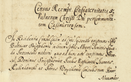 Z księgi radzieckiej Kazimierza obejmującej lata 1676–1684: fragment wpisu z 1677 roku dotyczącego czynszu sprzedanego na wyderkauf bractwu Ran Chrystusowych przez mieszczan kazimierskich, gdzie wymieniony został Wojciech Zawada młodszy – oraz zbliżenie zapisu imienia i funkcji (Archiwum Narodowe w Krakowie, sygn. K 45, s. 193)