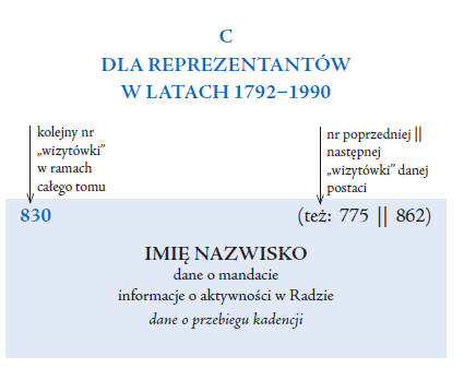 Ważną częścią przedstawienia każdej postaci jest górny pasek, na którym zamieszczone są przede wszystkim cyfry. I tak zawsze w lewym górnym rogu znajduje się kolejny nr „wizytówki” w całym tomie, przypisany danej osobie. Natomiast z prawej górnej strony paska podane są wcześniejsze lub późniejsze (jeżeli i jedne, i drugie, wówczas przedzielone znaczkiem „||”) numery przypisanych jej „wizytówek”. Rzecz dotyczy więc reprezentantów wielokadencyjnych: kierując się numerami, można łatwo prześledzić całą karierę danej postaci w gremiach przedstawicielskich.