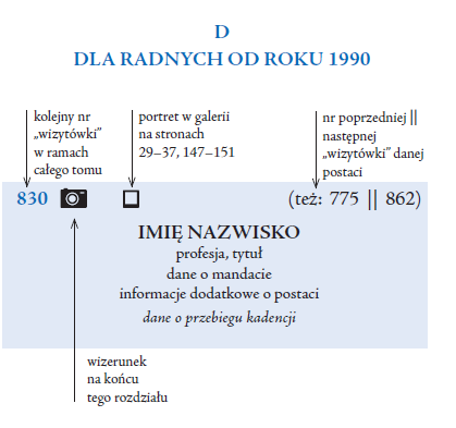 „Wizytówki” to skondensowane informacje o postaci – skrótowe, w jednych przypadkach limitowane dostępną wiedzą, czyli źródłami, w innych natomiast ograniczane założoną objętością. Przyjęto założenie, że umieszczane pod nazwiskiem hasłowe określenie, kim była dana osoba, powinno się odnosić do czasu aktualnego dla zasiadania w reprezentacji miejskiej. Brzmienie zapisu jest tu przeniesione bezpośrednio z archiwalnych materiałów źródłowych. W odniesieniu do radnych zasiadających w Radzie Miasta Krakowa od roku 1990 z tego wstępnego określenia zrezygnowano. Współczesna dynamika powoduje, że próby zamknięcia przekazu „kim jest/była” dana postać w krótkim, hasłowym wskazaniu są poznawczo wątpliwe, a często wręcz niemożliwe. Jednocześnie szczególne znaczenie mają tu względy formalne związane z przepisami chroniącymi prywatność, także względem osób pełniących funkcje publiczne. Od początku V kadencji RMK (rok 2006) zdecydowana większość radnych nie korzysta z możliwości autoprezentacji na powszechnie dostępnych stronach internetowych biuletynu informacji publicznej; jest to ważny przekaz dla redakcji tego tomu. Zrezygnowano zatem ze wstępnych określeń, zakładając, że biogramy współczesnych radnych wymagają odrębnego i obszerniejszego opracowania, choćby w postaci aneksu do niniejszego tomu.