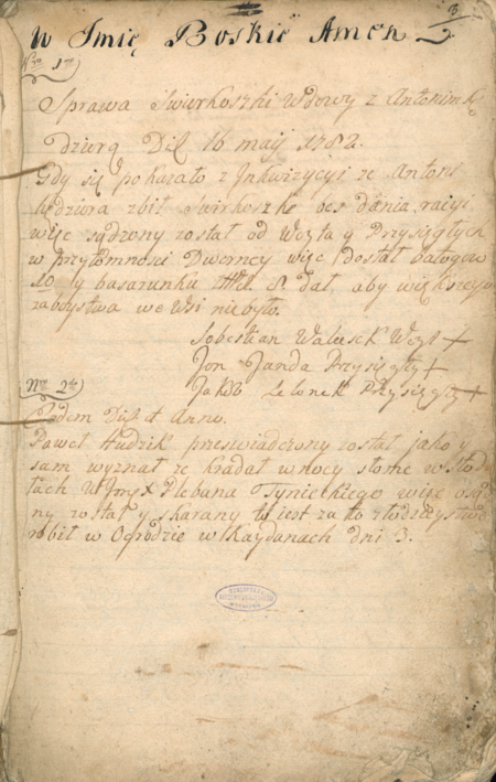 Z księgi gromadzkiej wsi Tyniec obejmującej lata 1782–1847 strona tytułowa oraz kolejna z wpisem sprawy rozstrzygniętej przez wójta i przysiężników (ławników) w 1782 roku – vide tekst poniżej: Protokul… etc. oraz Sprawa Swierkoszki… etc. (Biblioteka Naukowa PAU/PAN w Krakowie, sygn. rkps. 1871, s. 1, 3)
