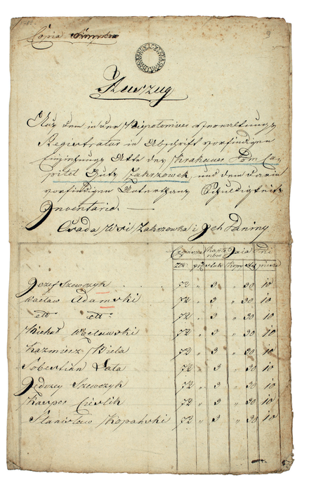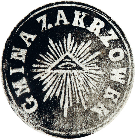 Metalowy tłok pieczętny używany przez gminę w okresie autonomicznym – lustrzane odbicie (Archiwum Narodowe w Krakowie, sygn. T 331)Z akt dotyczących wsi i cegielni Zakrzówek z lat 1717–1782: pochodzący z roku 1782 wykaz zaległych czynszów i danin składanych przez mieszkańców gromady zakrzowskiej (Archiwum Narodowe w Krakowie, sygn. GmP XII, s. 9–10)Z akt gminy Zakrzówek: odcisk samodzielnych pieczęci urzędowych dla gminy Zakrzówek i dla gromady wsi Kapelanka używanych jeszcze w okresie tworzenia autonomicznych struktur wsi i ich gmin (Archiwum Narodowe w Krakowie, sygn. GmP XII-10, s. 13)
