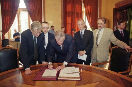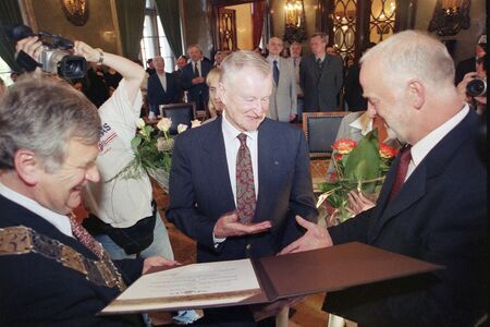 Z uroczystości wręczenia dyplomu honorowego obywatelstwa 14 maja 2002 r. w Pałacu Wielopolskich. Zbigniew Brzeziński podczas wystąpienia w sali Obrad RMK oraz własnoręczny podpis uhonorowanego