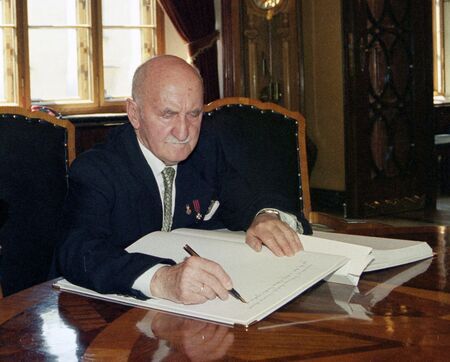 Z uroczystości wręczenia medalu i dyplomu 5 czerwca 2000 r. w Pałacu Wielopolskich. Zbigniew Chojnacki w sali Obrad RMK oraz własnoręczny podpis uhonorowanego.