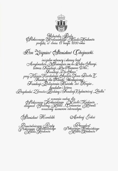 …w uznaniu szczególnych zasług dla Stołecznego Królewskiego Miasta Krakowa… (z uchwały Rady Miasta Krakowa nr LI/388/00) |