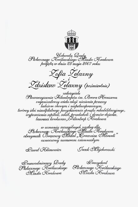 …w uznaniu szczególnych zasług dla Stołecznego Królewskiego Miasta Krakowa… (z uchwały Rady Miasta Krakowa nr XIV/175/07) |