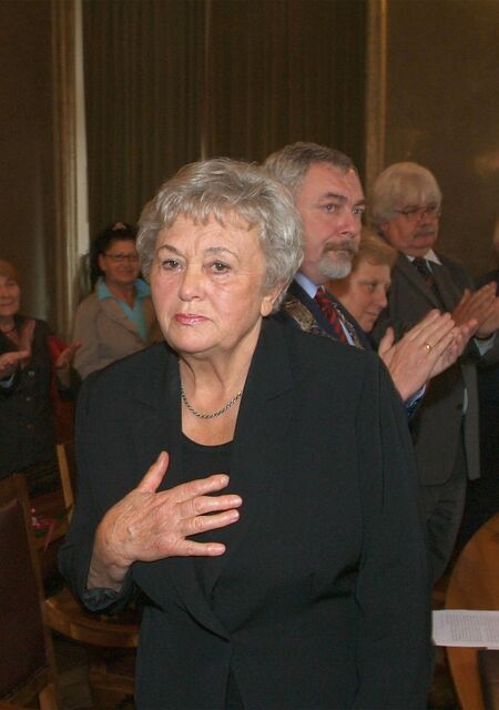 Uroczystości wręczenia medalu z dyplomem 3 października 2007 r. w Pałacu Wielopolskich: wystąpienie laureatki z mównicy prezydialnej RMK oraz reprodukcja dyplomu; ujęcie z sali Obrad.