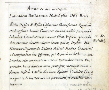 Z urzędowego spisu rajców obejmującego lata 1363–1802 fragment strony 31 z wpisem z 1696 roku o wyborze do rady miejskiej na miejsce po zmarłym Kazimierzu Bonifacym Kantellim (nr 539) nowego rajcy, Zygmunta Zaleskiego, jak zapisano: „starszego ławnika krakowskiego, obdarzonego niezwykłymi zdolnościami i wiedzą oraz znającego obce kraje” – oraz powiększenie zapisu imienia (Archiwum Państwowe w Krakowie, sygn. rkps 1477, s. 31)